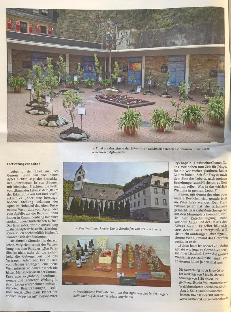 Nur wenige Tage nach der Eröffnung der Ausstellung zum Jahr des Apfels im Franziskaner- und Wallfahrtskloster Bornhofen konnte Pater Eryk Kapala den Pilgerstempel für den Rhein-Camino in Empfang nehmen. Der Wallfahrtsseelsorger zeigte sich sehr erfreut, denn nun haben Pilger und auch Wanderer auf dem Rheinsteig die Möglichkeit, neben dem Stempel fürdie Ausstellung zum Jahr des Apfels auch den Stempel für den Jakobsweg zu erhalten. Beide Stempel befinden sich im Bereich der Ausstellungsfläche am Marienplatz der Wallfahrtskirche. Der Zugang erfolgt über ein Portal hinter der PilgerhalleDie Franziskaner vom Kloster Bornhofen gehen seit ein paar Jahren neue Wege, indem sie die Wallfahrtsaison mit aktuellen Themen versehen, die alle Menschen angehen. Verbunden damit ist immer eine Ausstellung auf dem Marienplatz, der dem Jahresmotto entsprechend umgestaltet wird. Dabei setzen